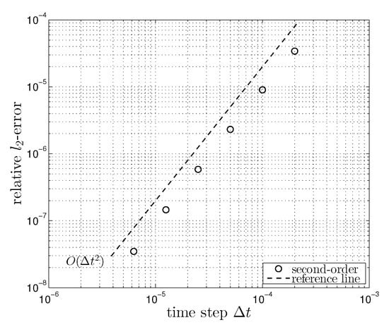 The computational domain is . We set , , and , and compute for . The coefficients in (7) are used and the grid size is fixed to which provides enough spatial accuracy. In order to estimate the convergence rate with respect to , simulations are performed by varying . Figure 1 shows the relative -errors of for various time steps. Here, the error is computed by comparison with a reference numerical solution using , i.e., is defined as , where is a solution with a time step and is the reference solution. It is observed that the method is second-order accurate in time.