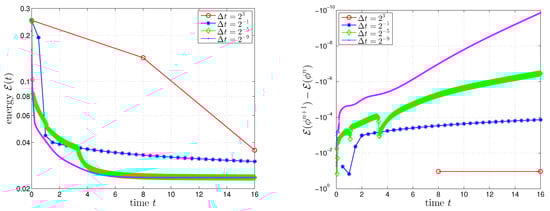 The computational domain is . Here, is a random number between and at the grid points, and we use , , , , and coefficients in (7). Figure 2 shows the evolution of the energy and its difference with different time steps. All the energy curves are nonincreasing in time even for sufficiently large time steps. Figure 3 shows the evolution of with .