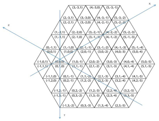 Each pixel in the triangular grid (we call it a trixel from now on) is addressed uniquely by a triplet of coordinates having axes with directions x,y and z to reflect the symmetry of the grid structure. In this grid, to the sum of the coordinate values reflects the orientation of the trixels, thus we differentiate two types of trixels: even (zero sum trixels has orientation ) and odd trixels (triangle pixels having orientation are addressed by triplets with 1-sum). Figure 1 shows the origin (trixel with coordinates (0,0,0)), the axes of the coordinate system and also a part of the grid with the assigned coordinate values.