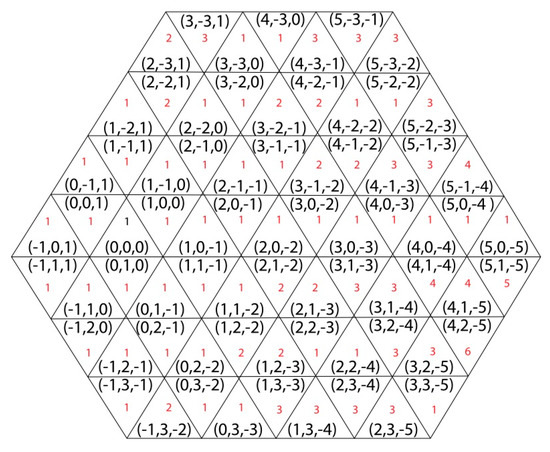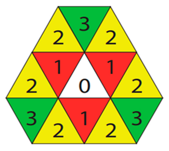 Each trixel in the triangular grid has three types of neighbors: there are three 1-neighbors, each of them shares a side with the original trixel, there are six more 2-neighbors and, further, there are three more 3-neighbor trixels. All twelve neighbors share at least one point on the boundary with the original trixel (see Figure 2). One can also define formally the neighborhood relations based on the coordinates of the trixels:
