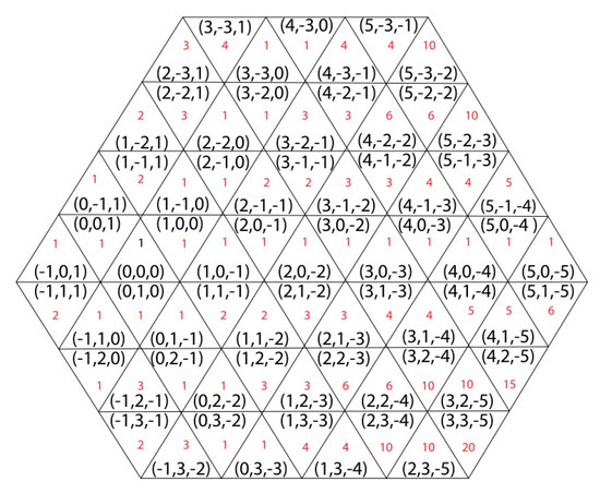 Figure 6 shows the number of shortest paths from trixel (0,0,0) to the displayed trixels in the case 2α = β and 3α < γ.