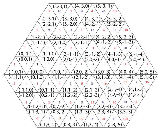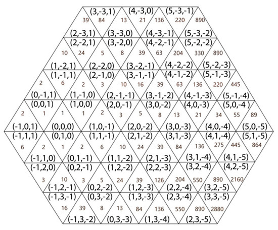 In Figure 5, one can observe the number of shortest weighted paths from the trixel (0,0,0) to some other trixels in case 2α < β < γ < 3α.