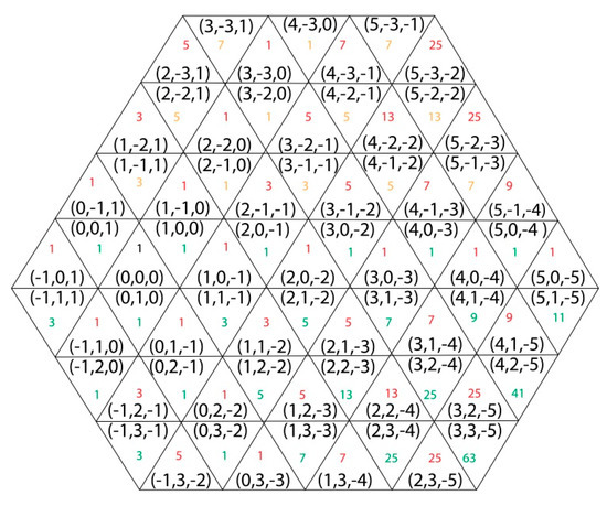 In Figure 7 the number of weighted shortest paths from the origin (0,0,0) to some trixels are presented in case of 2α < β and 3α = γ. The sequence of odd number can be seen as embedded next to the lanes containing the origin and having only 1′s.