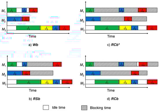 Jobshop with different blocking constraints. (a) Wb, (b) RCb*, (c) RSb, and (d) RCb.