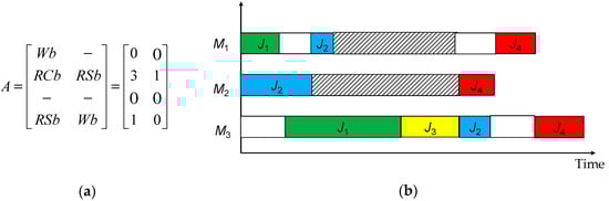 JS problem with mixed blocking constraints. (a) blocking constraints matrix, and (b) corresponding Gantt chart.