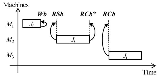 If an RSb blocking constraint exists after operation Oij on job j, then B0ij = 0, B1ij = 1, B2ij = 0 and B3ij = 0. Equation (6) then simplifies itself as Si1j1 ≥ (Si(j+1)). (L1ij + L0ij) + (Sij + Pij). L2ij. If Oij is the ultimate operation of job j, then L2ij = 1 and L1ij + L0ij = 0, and Equation (6) becomes Si1j1 ≥ (Sij + Pij) and expresses only a precedence constraint for Oi1j1. However, if Oij is not the ultimate operation of job j, then L2ij = 0 and L1ij + L0ij = 1, because this operation is either the penultimate, or any other one. In this case, the precedence constraint (6) then becomes Si1j1 ≥ (Si(j+1)), which is the expression of the RSb blocking constraint.