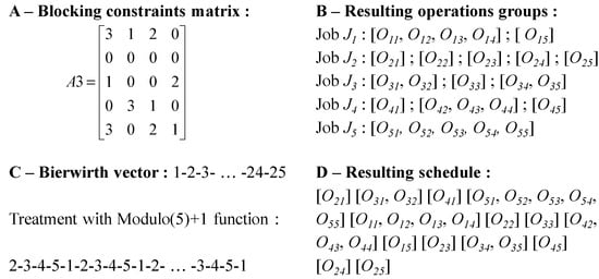 To see how operations are taken into account by the evaluation function, we propose to treat a mixed blocking constraint matrix example with five jobs, each composed of five operations (Figure 5). First, the blocking matrix is translated into groups of operations, job after job. Next, the meta-heuristic vector is translated into a Bierwirth vector using the above-described transformation, modulo (5) + 1, in the presented example. Then, using the function of the resulting Bierwirth vector, groups of operations are put in the schedule in the order of their job number. If all the operations of a job are already placed in a schedule, the evaluation function ignores this number and proceeds to the following one until all operations and groups are placed in the schedule.