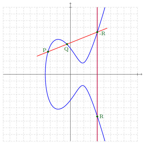 This alternative expression is quite useful, as it allows defining a special point, which is called the point at infinity and is typically represented as . The point at infinity cannot be obtained through the homogeneous form and is paramount when operating with the points of the curve. More specifically, for any point P on the curve, the point of infinity acts as the identity element in the point addition operation, guaranteeing that . Figure 1 shows graphically how the addition of points P and Q produces point R when using an elliptic curve defined over the field of the real numbers.