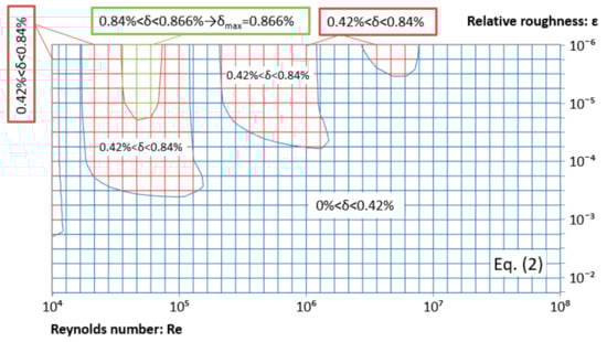 Distribution of the relative error for the proposed rational approximation procedure, Equation (2), is given in Figure 1. The maximal relative error goes up to 0.866% for 0 < ε < 0.05 and 4000 < Re < 108 (as used in engineering practice). The highest error using 2 million input pairs found by the Sobol quasi-Monte Carlo method is for Re = 71987 and ε = 3.1711·10−7 []. The Colebrook equation is empirical and it follows logarithmic law, so for the procedure with only rational functions, this level of error is acceptable []. For example, Pimenta et al. [] classify the approximation of Sonnad and Goudar [] with relative error of up to 3.17%. With two logarithms and one non-integer power, this method [] belongs to the group of approximations with higher performance indexes and precision. Brkić [] estimates the relative error of Sonnad and Goudar [] to be up to 0.8%, which is similar error compared with the rational approximation approach presented here; the same methodology as in Brkić [] is used for Figure 1.