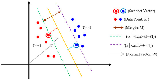 According to Figure 1, is the data points of the two classes labeled such that is the optimal hyperplane assigned in the middle of the other two lines, i.e., and , so that w is a normal vector for the optimal hyperplane, and also, b represents the offset between the hyperplane and the origin plane. Furthermore, margin of the separator is the distance between support vectors. As a result, the maximum margin can be expressed in the form of the following constraint optimization equation [18,22,23,24]: