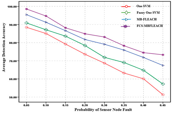 According to Figure 7, the proposed FCS-MBFLEACH method at different time points has the highest detection accuracy compared to other methods. When the probability of fault is equal to 5%, the average fault detection accuracy for the proposed FCS-MBFLEACH method compared with one SVM, fuzzy one SVM, and MB-FLEACH is improved 10.11%, 7.69%, and 3.15%, respectively. In addition, for the highest probability of fault (45%), the detection accuracy of the proposed method compared to one SVM, fuzzy one SVM, and MB-FLEACH has preference with the values of 22.03%, 16.12%, and 5.88%, respectively.