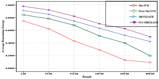 The average remaining energy after detecting the sensor node fault in the network regarding the cluster heads is crucial for selecting the super cluster head for the proposed FCS-MBFLEACH method so that in both scenarios, the average of remaining energy in joules against different rounds after the fault detection for the methods is computed, as shown in Figure 15 and Figure 16. The values of the average remaining energy for the algorithms are assigned for two scenarios in Table 2 and Table 3.