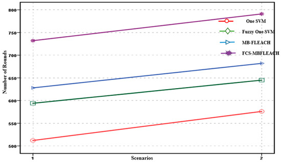 In addition, the network lifetime based on HND in Figure 18 shows better performance in both scenarios for the proposed FCS-MBFLEACH method compared to the other methods. As for the proposed method, HND will occur for the first scenario in round 732, and it will occur for the second scenario in round 791. Finally, a comparison between the SVM, fuzzy one SVM, MB-FLEACH, and FCS-MBFLEACH algorithms in terms of accuracy detection and FPR criteria is demonstrated for two scenarios with densities equal to 5 and 10 in Table 5.
