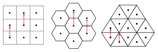 The square, hexagonal and triangular grids. Midpoints of the pixels represent their gridpoints. Any grid-vector translates the square and hexagonal grids to themselves, respectively. However, it is not the case in the triangular grid.