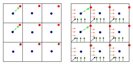 A bijective and a non-bijective translation left and right, respectively. The translation vector is shown. In the case of non-bijective translation, two distinct points have the same image and there are pixels that do not correspond to any original pixel.