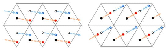 The sets of the odd and even triangles (their midpoints) of the triangular grid can be described in the Cartesian coordinate system by the two sets defined in Equations (1) and (2), respectively.