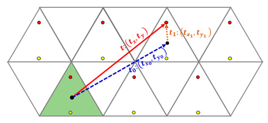 For any translation vector t(tx, ty) , we draw it and consider it in a way that we fix its starting point to the grid origin, which is an even midpoint. Then, moreover, we write t as a sum of two vectors, the so-called integer and fractional vectors making some analogy to the traditional grid case. The integer vector will start at the grid origin and end at the closest even midpoint (technical details about this are discussed in the next subsection) to the endpoint of the original translation vector t. On the other hand, the fractional vector will start from the endpoint of the integer vector and end at the endpoint of the original translation vector t, and t1 is the “fractional” vector.