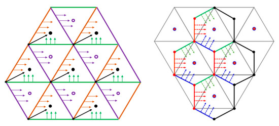 Now, in order to describe these non-bijective translations mathematically, the six equilateral triangles Ni where i = 1…6 (the green regions in Figure 7), will be categorized into two groups. The odd and even groups are based on the base odd and even Δ triangles in which these green triangles are located. Remember that the translation vectors in our description start at the midpoint of an even triangle (e.g., the origin), and we deal with its fractional part.