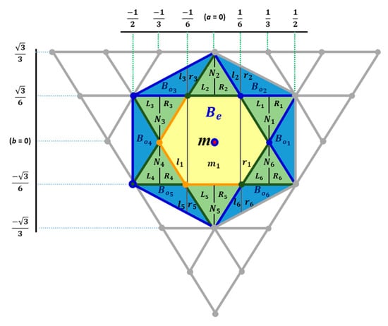 First, the bijective translations are considered. Let us analyze translation vectors with the fractional part ending in the B regions. There are two groups of B regions: Be and Bo based on their locations in the even triangle Δ, or in an odd triangle , respectively. These bijective translation regions are described as follows. In an even triangle, consider a regular hexagon Be with a side length of and its center point is the even midpoint. While in the odd triangles, consider the six obtuse-angled triangles (i = 1…6) as shown in Figure 7. Instead of proving the bijectivity of these cases with common proof here, we show that the two types of regions, although in both cases the translations are bijective, have very different behavior. We define and differentiate strongly and semi-bijective translations: