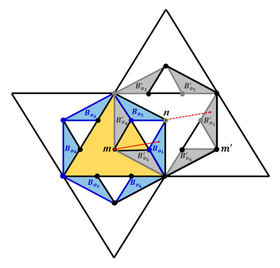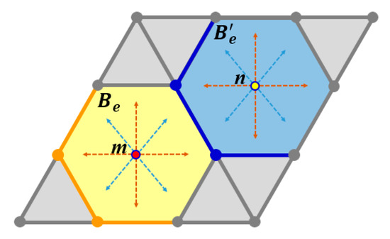 Based on Proposition 1, we need to prove that translation with the fractional vector belonging to region Be preserves the parity of the pixels. Without loss of generality, consider Be (the yellow) and (the blue) isometric regular hexagons within the area of the even and odd triangles, respectively, in Figure 8. Here, m (the red) and n (the yellow) points are the midpoints of the even and odd triangles, respectively.