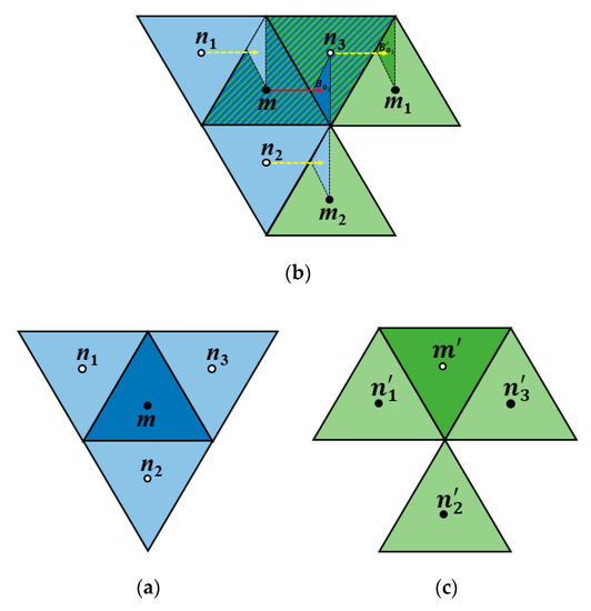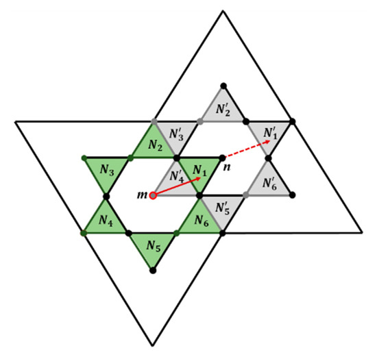 Based on Proposition 3, we need to prove that translation with fractional vector t1 belonging to region Ni where i = 1…6, will map every pixel to the same type of pixel. Without loss of generality, consider the regions N1 (green) and (gray) in Figure 11. They are, in fact, isometric regular triangles within the area of an odd triangle. Points m (red) and n (yellow) denote the midpoints of the corresponding even and odd triangles, respectively.