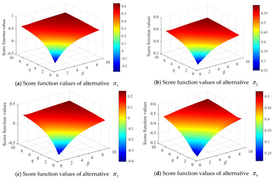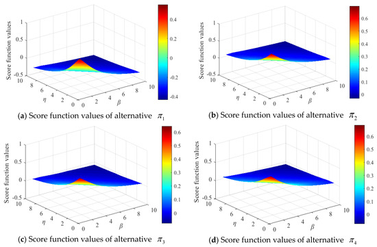 Based on the interaction operational laws defined in Definition 7, ( a k i ) β = ( ( 1 n k i m k i ) β ( 1 n k i m k i p k i ) β , ( 1 n k i ) β ( 1 n k i m k i ) β , 1 ( 1 n k i ) β ) and ( a k j ) η = ( ( 1 n k j m k j ) η ( 1 n k j m k j p k j ) η , ( 1 n k j ) η ( 1 n k j m k j ) η , 1 ( 1 n k j ) η ) .