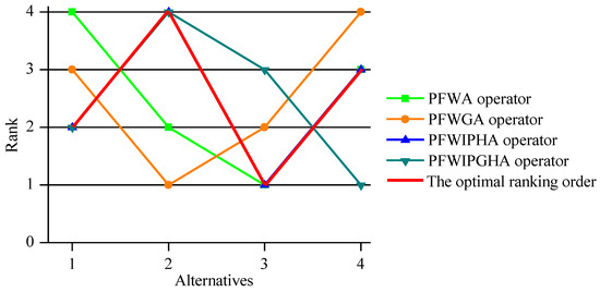 For clarity, the optimal ranking order and four ranking orders in Table 3 are simultaneously depicted in the same figure (See Figure 3). It is clear that the optimal ranking is the same with the ranking order through adopting P F W I P H A operator. The difference between the optimal ranking and the ranking result by utilizing P F W I P G H A operator is small. Conversely, a larger discrepancy can be seen among the optimal ranking order, the ranking order with P F W A operator, and the ranking order with P F W G A operator. All of these indicate that the presented method is more suitable than the existing methods in disposing decision making problems with interactions and partitions of inputs.