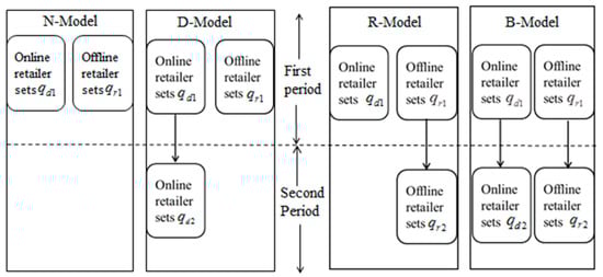 This paper focuses on four common models, online and offline retailers would have four different quantitative behaviors. The first model is a benchmark model without considering the second promotion period (denoted “Model N”). In the second model (denoted “Model D”), only the online seller provides a price discount in the second period. This setting is motivated by the online promotion on “Cyber Monday” in the United States or “Double Eleven” in China. Inspired by store promotion on “Black Friday”, some offline retailers promote products in the second period (denoted “Model R”). At last, both the retailers adopt promotion strategies in dual channels (denoted “Model B”). Figure 1 presents the sequence of events under the four models.