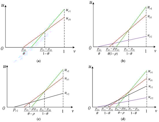 Generally speaking, (or ) is a threshold value that consumers have a positive utility buying through an online channel (or an offline channel) in Period 2. The consumer who is indifferent between buying products through an offline channel and an online retail channel in Period 1 is located at , which could be observed intuitively in Figure 2a. Then, for a consumer who prefers the online channel in Period 1 to the online channel in Period 2. The consumer’s valuation should exceed , which is shown in Figure 2b,d. Next, from Figure 2c,d, we can obtain that each consumer whose valuation exceeds would consider buying from the online retailer in Period 1 rather than buying in the offline channel in Period 2.