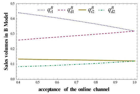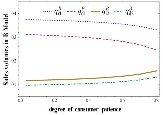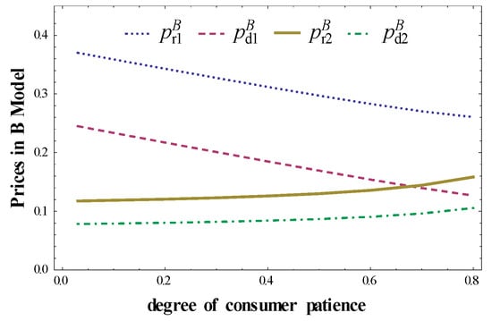 First, take a closer look at the implications of consumer patience for two parties’ outcomes in Model B. When the acceptance of the direct channel is given, taking , the properties of sales volumes and prices about , will be represented in Figure 3 and Figure 4. Taking , we obtain the properties of sales volumes and prices about , , which are shown in Figure 5 and Figure 6, respectively.