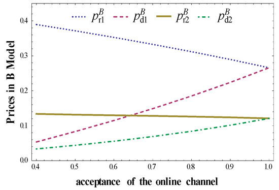Arya et al. (2007) studied the same problem as in Model N without considering strategic consumers [3], while in our paper, we examine how acceptance of the online channel affects the whole pricing strategy of dual channels. Proposition 1 elaborates that in Model N, the sale price decided by the online retailer increases with rising acceptance of the online channel. Intuitively, as the competitor of the online retailer, the performance of offline retailer results has declined with the increasing acceptance of the online channel. This observation is partly consistent with the property of the offline retailer in Chiang et al. (2003) [4]. They stated that when acceptance of the online channel is below a cannibalistic threshold, the optimal prices and quantities are not influenced by the acceptance of the online channel. However, we further find that the acceptance of the online channel plays an important role for the online retailer no matter how small of consumer acceptance of the direct channel is.