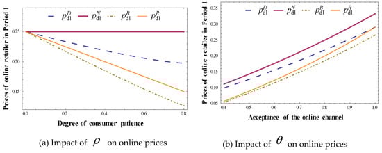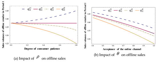 Figure 7, Figure 8, Figure 9 and Figure 10 verify the monotonic properties of quantities and prices with respect to parameters, as stated in Propositions 3, 5 and 7. The acceptance of the online channel has a positive impact on online retailer’s prices and quantities, while it has a negative impact on the offline retailer’s prices and quantities. All quantities in Period 1 except for offline retailer’s quantity are decreasing with the increase in the degree of consumer patience because of inter-periodic competition. However, counter-intuitively, as shown in the left-hand of Figure 7, the sales volume of the offline retailer increases with the increase in the degree of consumer patience in Model D. In Model D, offering the online channel in Period 2 is a serious threat to the offline retailer. To compete against the online channel and protect its market share in Period 1, the offline retailer has to cut its retail price as the only effective tool even confronted with patient consumers. Thus, the offline retailer’s sales volume increases. As displayed in the left-hand of Figure 8, the sales volume of the online retailer also increases with increasing degree of consumer patience in Model R for a similar reason.