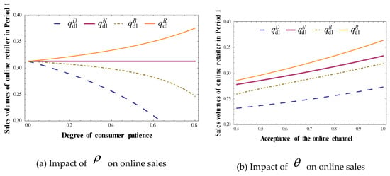 Proposition 3 shows that when the acceptance of the online channel is high, or consumers prefer to wait, online retailers strategically raise the price in Period 2 to obtain a high marginal benefit. What is more, as consumers become more patient, the online retailer extends the sales volume in Period 2 and reduces it in Period 1 in response to alleviate the competition pressure with the offline retailer in Period 1. From the offline retailer’s viewpoint, offering an online channel in Period 2 is a serious threat to the offline retailer. To compete against the online channel and protect its market share, the offline retailer has to cut its retail price as the only effective tool. Thus, the offline retailer’s sales volume increases. Finally, as the direct channel becomes more attractive, more consumers would choose to buy from the online channel instead of the offline channel.