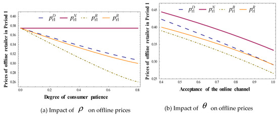 In the offline channel, more patient consumers in Period 1 would shift to purchase in Period 2. As a result, the sales volume through the offline channel in Period 1 decreases with the degree of patience, while the sales volume in Period 2 increases. But it seems counter-intuitive that more patient consumers will not wait for lower prices in Period 2. Confronted with patient consumers, offline retailers’ marketing strategy of setting a high price in Period 2 aimed at attracting consumers to purchase in Period 1 since they could obtain a high marginal profit in Period 1 since .