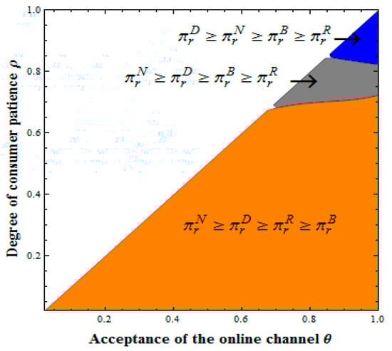 In this section, we graphically show some regions with the pair of parameters where we compare selling quantity sequences in Period 1, the online retailer’s profit sequences, and offline retailer’s profit sequences under four different models. Some discussions about these figures are given in the following.