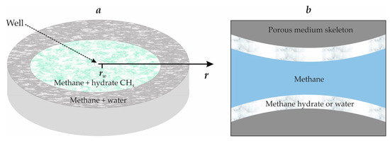 This paper considered the frontal regime of methane hydrate formation (Figure 1a). For this regime, there are two zones in the formation saturated respectively with methane and its hydrate (near or first zone) as well as gas and water (far or second zone). It was assumed that hydrate is located on the walls of the pore channel (Figure 1b), so the hydrate saturation Sh, is the fraction of the pore volume occupied by hydrate, with the rest of the pore volume, equal to 1–Sh, saturated with mobile gas. The same assumption was applied to water.