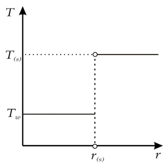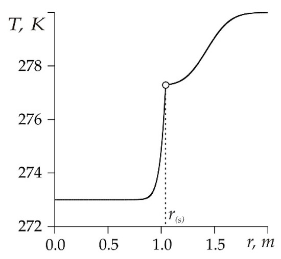 Figure 2 shows that the temperature in a small section of the reservoir near the surface of the CH4 hydrate formation sharply rose from Tw to T(s) (i.e., we can talk about a temperature jump [23]). In this case, to obtain an approximate analytical solution, it is possible to simplify the conditions at the phase transition boundary by adopting a stepwise change in the temperature by coordinate r.