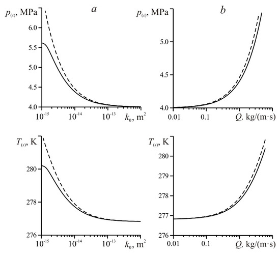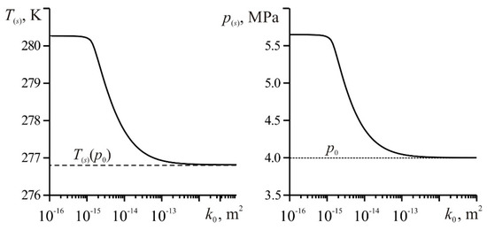 Figure 4 shows that for a highly permeable medium (k0 > 10−13 m2), the pressure on the phase transition surface asymptotically approaches p0, and the temperature on this surface approaches the equilibrium phase transition temperature T(s)(p0), determined from Equation (2) for the pressure p0. Thus, at sufficiently high permeability values (k0), the following conditions are met: