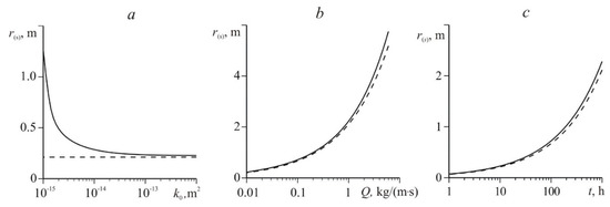 Change of the coordinate of the phase transition boundary depending on the permeability (a), mass flow rate (b), and time (c); a and c − Q = 0.01 kg/(m∙s), b and c − k0 = 10−12 m2; other parameters correspond to Figure 2.