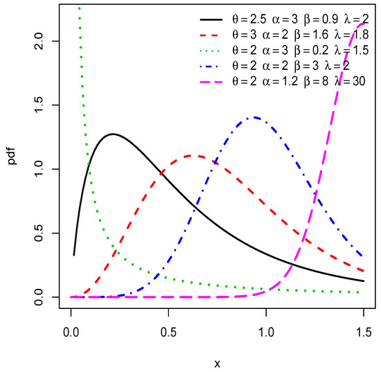 with . In addition, by Equations (6) and (4), the corresponding pdf follows: