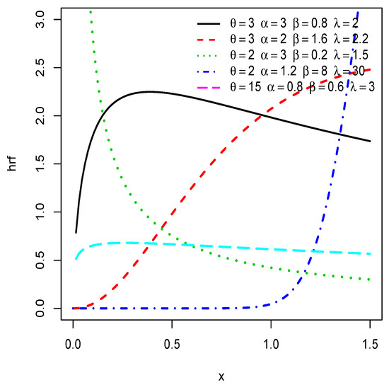 Then, the sign of the real number can inform us on the nature of . Again, no closed-form for exist, but we can evaluate it numerically at least. The flexibility of is illustrated in Figure 2 for selected values of , , , and . In particular, we observe that is increasing, decreasing, upside-down bathtub, and constant shaped.
