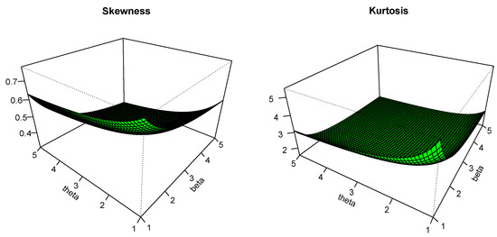 Three-dimensional plots for S and K are proposed in Figure 3 and Figure 4. We see smooth variations for the three-dimensional surface corresponding to these measures (in green), with possible high variations according to the values of the parameters, showing the flexibility of the distribution on these aspects.