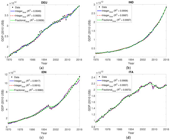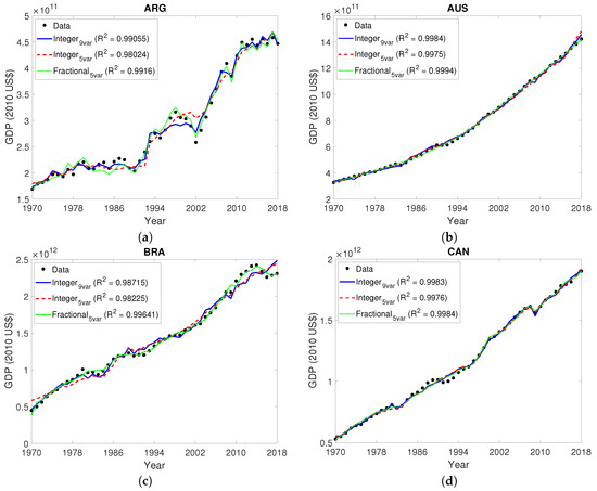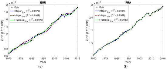 Figure 2, Figure 3 and Figure 4 show the results of the models obtained for each country from data for the entire 1970–2018 period. The performance indices are tabulated in Table 1, Table 2 and Table 3. In those tables, the t-values given in bold are those corresponding to variables which, assuming a 5% significance level, are necessary for the model. This information is also given in Table 4. It turns out that variables important for modelling six or more countries are , , , , and . That is why model (1) could be simplified into model (2), which is in its turn generalized to fractional orders by model (3), only considering , , and to have fractional influence.