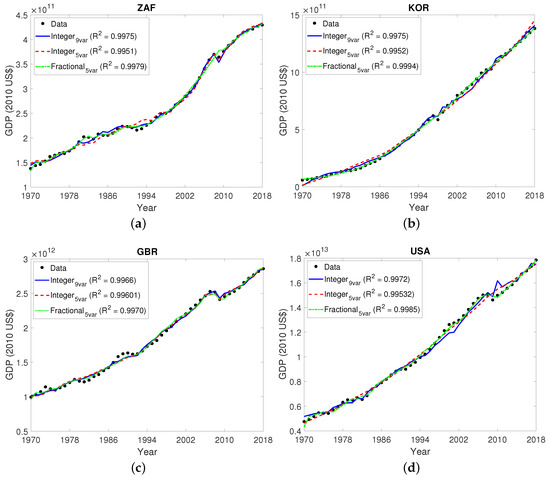 Results obtained with integer and fractional models for the following members of the G20: (a) South Africa (b) Korea (c) United Kingdom (d) United States of America. GDP estimations were obtained with integer models (1) and (2) and with fractional model (3). values are given to show the quality of the results of each model. As GDPs have different orders of magnitude, different scales were used in the y-axis for different countries.