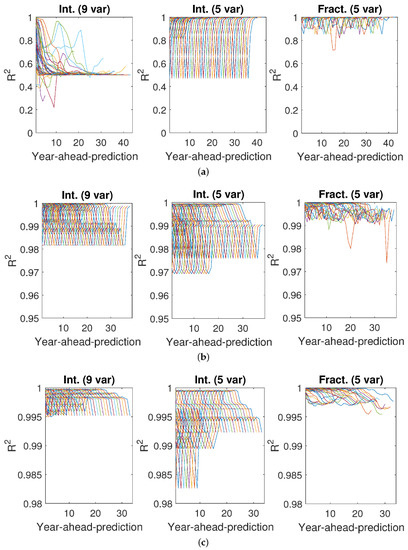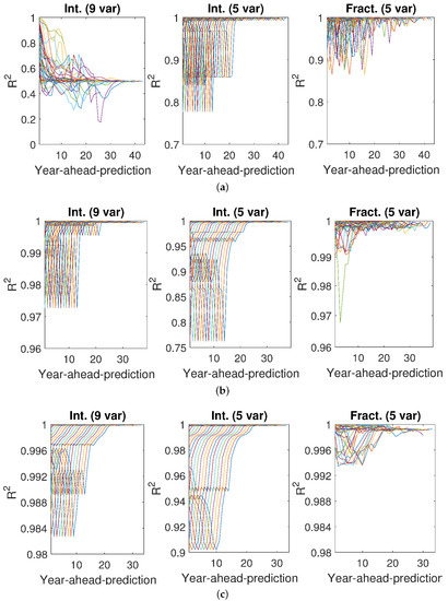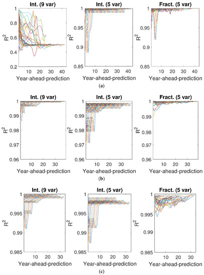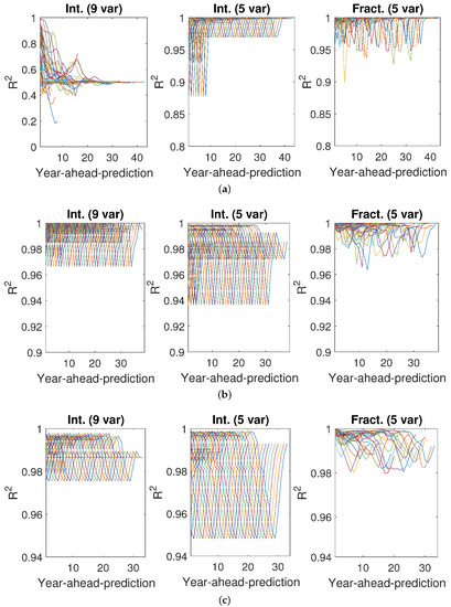 Notice that models obtained with data from periods beginning in the 1970s can be used to predict the GDP for many years until 2018. On the other hand, models developed with data from periods ending in the 21st century can be used to predict the GDP for a few years only. Furthermore, predictions for many years into the future have, as can be expected, a lower performance than those for years close to the end of the data from which the model was got. In fact, the performances in Figure 5, Figure 6, Figure 7, Figure 8 and Figure 9 deteriorate over time, but are quite good at prediction for a short period, and here again fractional models show their better performance, as values do not decrease so significantly.