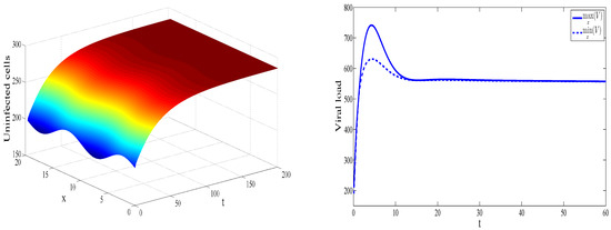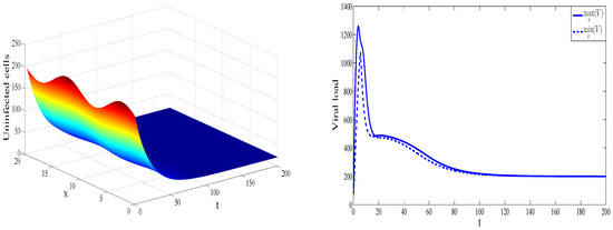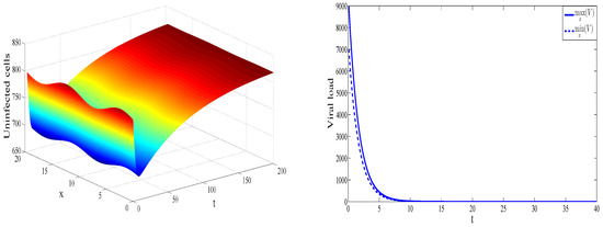 Figure 1 shows spatiotemporal dynamics of uninfected cells (left) and the maximal and the minimal values of the virus concentration in space as a function of time (right). For the values of parameters considered in this example, the basic reproduction number , which implies that the virus-free equilibrium is stable. Therefore, as expected, solution converges toward the equilibrium .