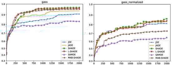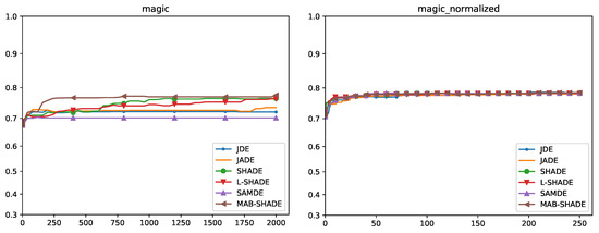 On MAGIC all the methods converged to the same solution, whereas on QSAR the best solution was reached by MAB-SHADE and jDE. Regarding GASS, no analyzed method reached a solution comparable in terms of quality to the solutions found on the corresponding original dataset. Finally, on MNIST all the methods, except SAMDE, reached good solutions, which are, however, below the solutions found with SHADE on the non normalized datasets.