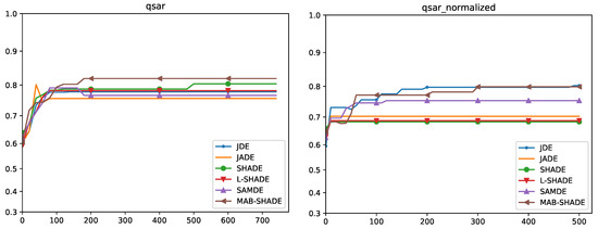 In this subsection, we discuss the convergence across all DE used and analyzed in this paper on the datasets discussed before. On the MAGIC dataset, SHADE and L-SHADE converge in around 1750 generations, whereas the proposed MAB-SHADE requires only 250 generations to achieve a solution with a comparable quality. Other methods were able to discover lower quality solutions only. Regarding the other binary classification problem, QSAR, MAB-SHADE converges faster than all the other methods in less than 200 generations, while simultaneously obtaining a higher quality solution.
