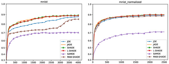 On the image classification problem MNIST, SHADE and L-SHADE resulted the best algorithms in terms of the solution quality and the time of convergence, whereas the other methods did not obtain comparable solutions in terms of quality; noticeably, MAB-SHADE did not get stuck, but it is likely that it requires more generations to converge to a solution.
