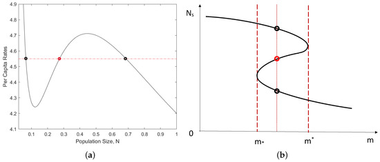 Properties of the model given by Equations (1) and (2) in the baseline case of constant m. (a) An example of the relative position of the per capita recruitment rate (black curve) as a function of N (in abstract units) and the per capita withdrawal rate (red line). Any intersection between the two lines is a steady state. The two stable steady states are shown by the small black circles, and the unstable steady state is shown by the red circle. (b) A sketch of the bifurcation diagram: The thick black curve shows the steady state value as a function of m. The two long-dashed vertical lines correspond to the bifurcation values of m; for any value of m such as (see the vertical dotted line), the system has three steady states, two stable and one unstable.